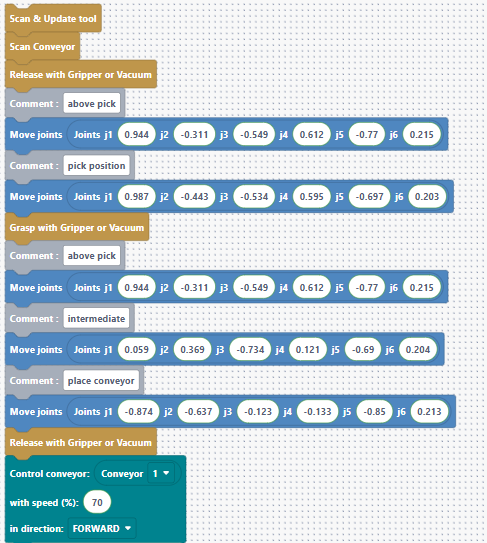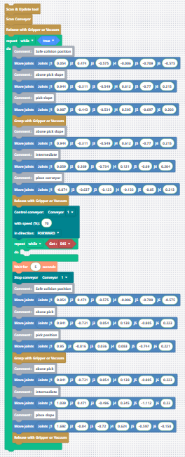 “To make sure the robot detects all the connected tools, like grippers and conveyors, we should always add the Scan & Update Tool and the Scan Conveyor blocks at the very beginning of the program.”