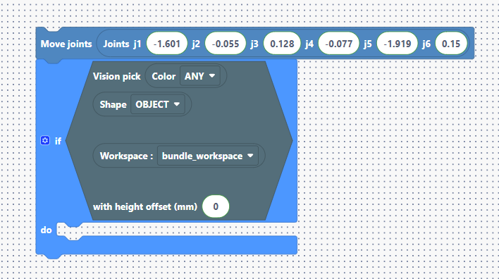 Add an If block containing the Vision Pick template, and select the correct workspace: bundle_workspace.