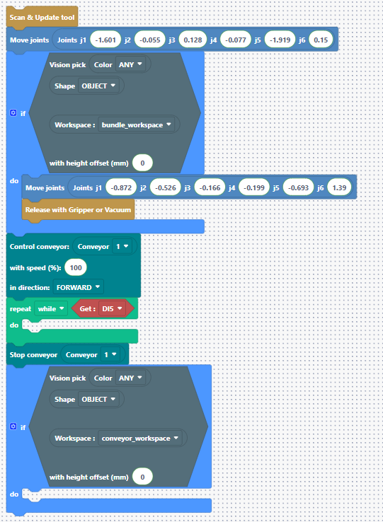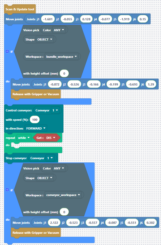 Since you are using the conveyor, add a use conveyor block at the top of your program to ensure the robot detects the conveyor. -