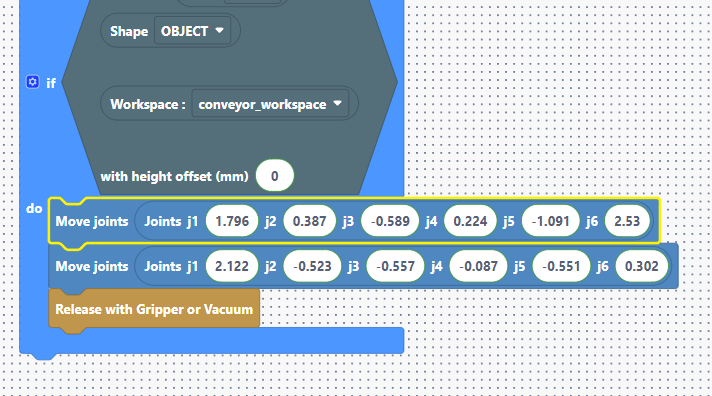 Move the robot above the left side of the conveyor, Save this as your place position, and add a Release with Tool block.