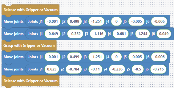 “Right after the position where the robot grabs the object, I add a Grasp block — this closes the gripper.”