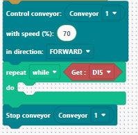 “So I’ll add a While DI5 is HIGH loop — this means the conveyor will keep running while no object is detected. As soon as DI5 changes to LOW, the loop ends and I immediately stop the conveyor.”