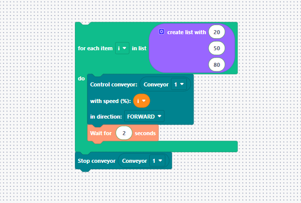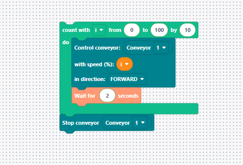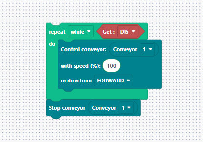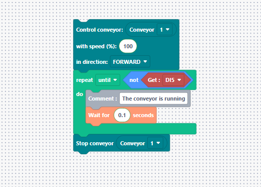 "Let’s look at a full example. We want the conveyor to run and the robot to pick items only when they arrive at the end stopper. We use a Repeat While block linked to a sensor. Inside, we have our conveyor block. Once the sensor detects the token, a 5-second delay is applied to ensure the token is properly seated against the end stop.