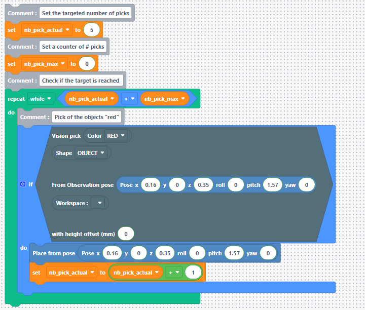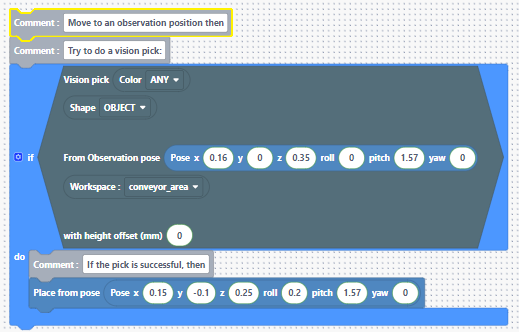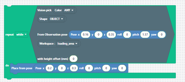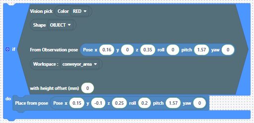 To pick an object using Vision, you can use the Vision Pick Block. It will return True if an object is detected and picked, so it has to be put in a logic condition block ⇨ if the action happens, we can place the picked object. You can find the example in the Templates of the vision tab of Blockly.