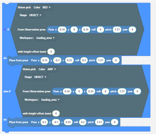 With this program, the Ned2 will try to pick a red object, then place it in an area. If there is no red object in the workspace, Ned2 will take another object to place it in another area.