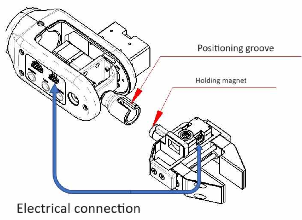 - Then, connect the gripper to the corresponding plug on the right side of the end effector.