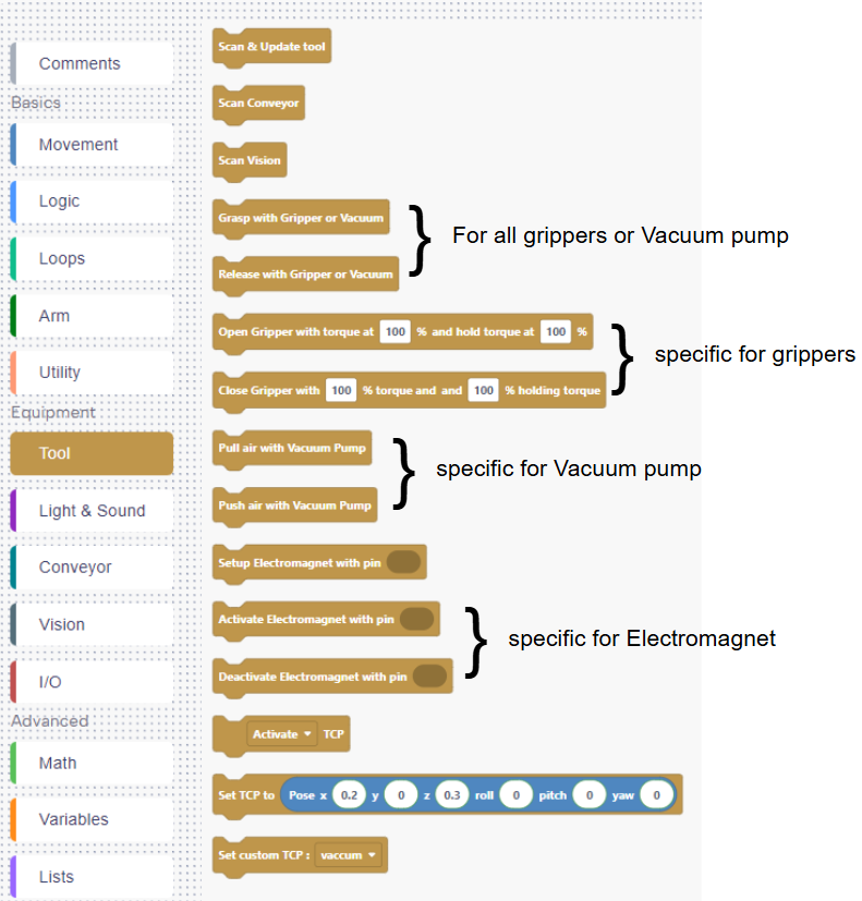 - Alternatively, you can use the block "Scan & update tool" to run a scan of all the I/O of the robot and start using the tools in your Blockly program.