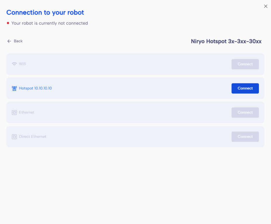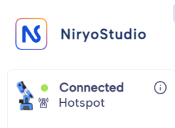 - Connect NiryoStudio: Start NiryoStudio, click on Connect robot button and select Hotspot.