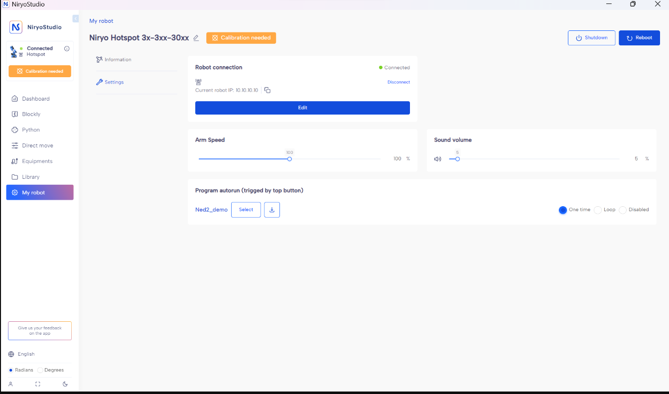 - Click “Connect robot” to access Ned2 connection