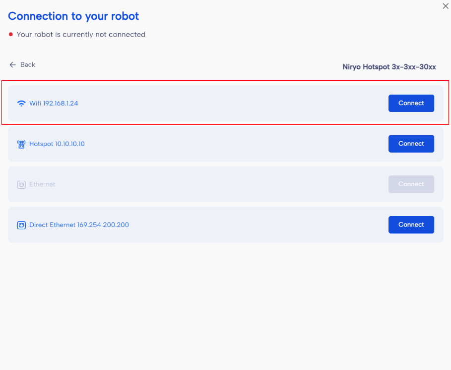 - Select your robot , then connect with the Ethernet