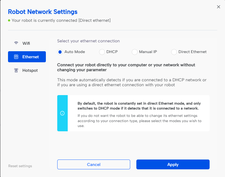 Auto Mode lets the robot automatically choose the correct Ethernet configuration.