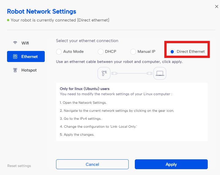 - If the robot is connected directly to your computer → it will use Direct Ethernet (APIPA).