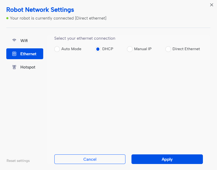 To ensure the best performance, lowest latency, and most stable connection, we strongly recommend using an Ethernet cable (provided with your robot). Wireless connections should be used primarily for quick configuration or light mobile use.