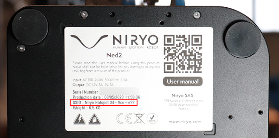 Your robot has its own Wi-FI network (SSID), which is named Niryo Hotspot XX-XXX-XXX, visible below its base.